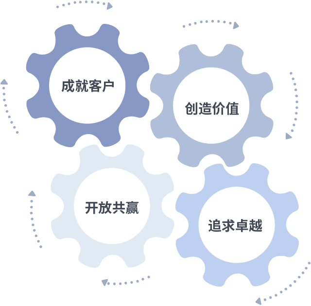 成就客户是一切决策的出发点,,创造价值是衡量所有工作的标准,,追求卓越是我们做事做人的态度,,开放共赢是我们的格局也是最终的结果。。。价值观的齿轮环环相扣,,,,推动着组织里的每个人不断向前。。。