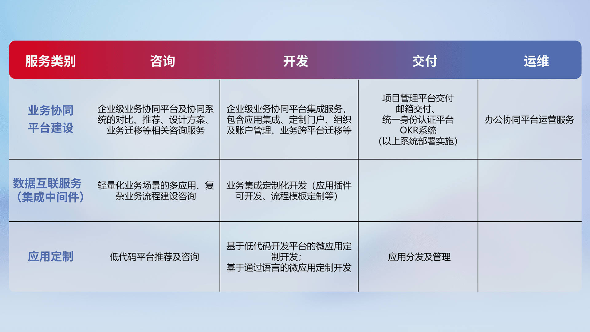 针对钉钉、、企微、、、、IDaas等平台级产品提供产品的规划、、方案、、交付、、、定制化开发等服务,,,实现如统一协同办公、、、智能客户服务、、、、混合会议管理、、、智能数据查询、、、等业务场景,,,实现数字化转型。。。